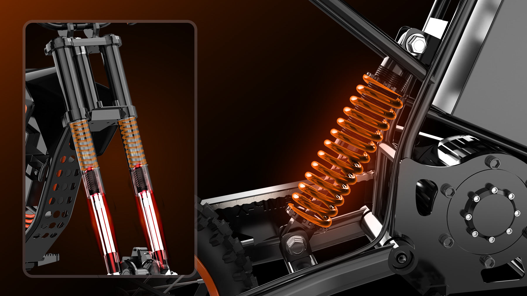23.6" dual-crown hydraulic front fork paired with a sport-tuned 10.2" centrally mounted rear shock delivers exceptional support during hard acceleration, quick braking, and aggressive off-road riding. It also absorbs high-frequency vibrations, reducing hand fatigue for a smoother experience.