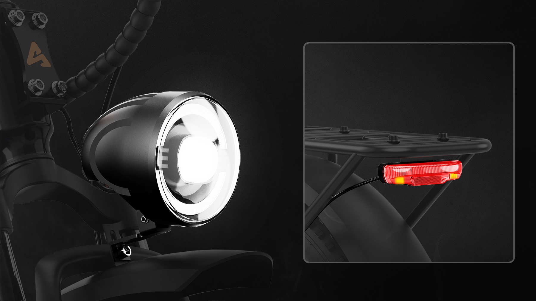 Front headlight features a professional lens with three high-intensity LEDs, 30% brighter than standard lights, reaching up to 100 feet for safer night rides. It also has an integrated horn for convenience.
