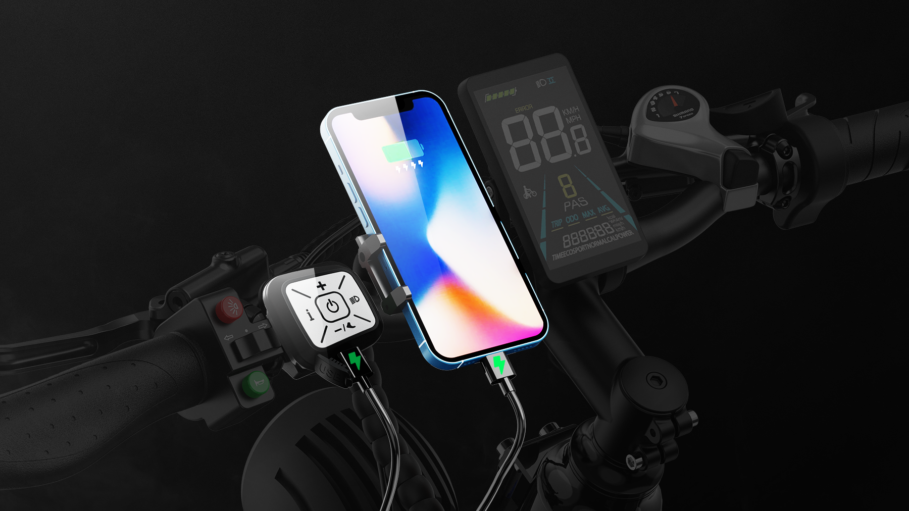 The display integrates a variety of important information display, you can clearly see the speed, power, mileage and other key information; Equipped with a USB charging port underneath the handlebar control switch, you can charge mobile devices such as phone and Gopro to record great moments on the road.