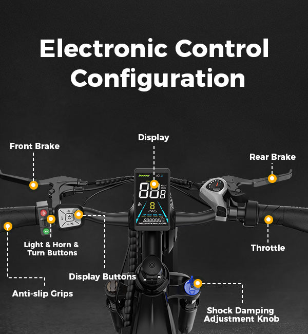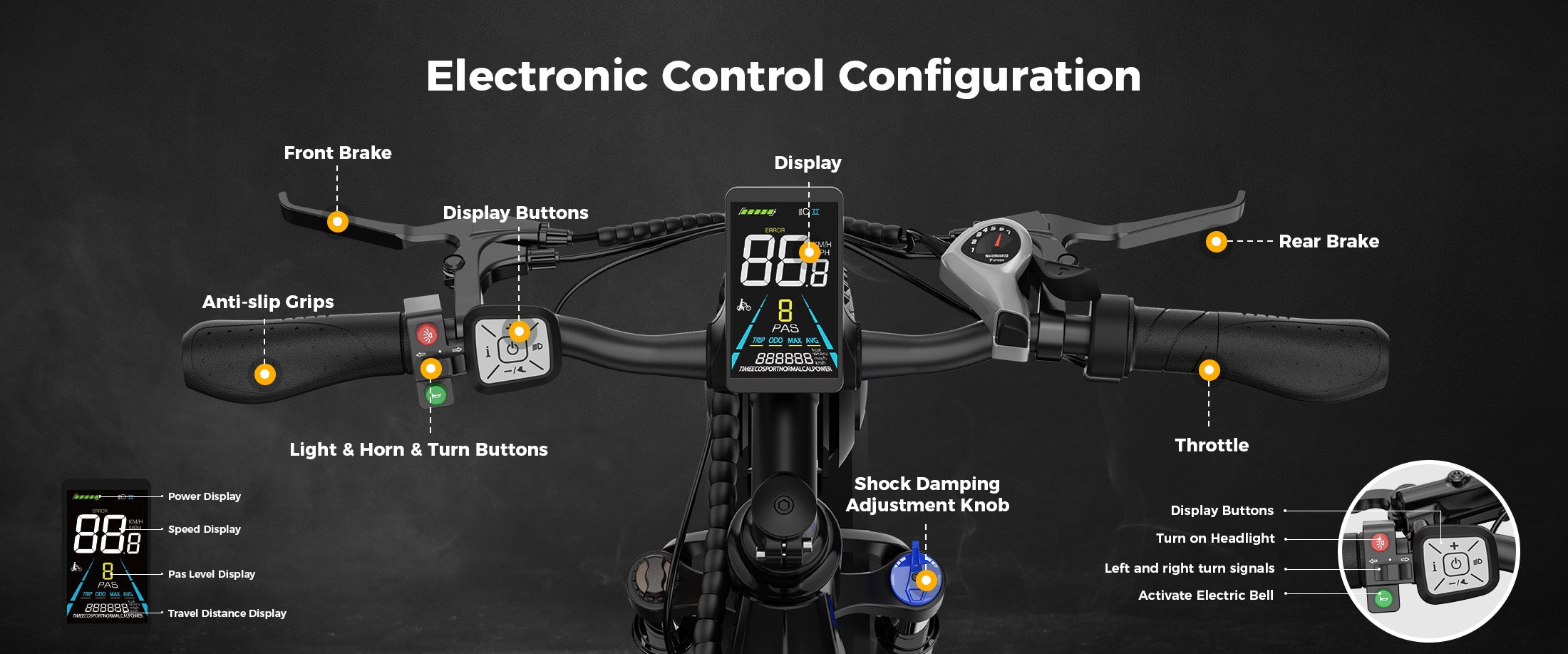 ⚡ User-Friendly Controls: Simple handlebar layout with a clear display for easy navigation and power management.